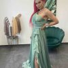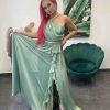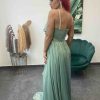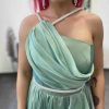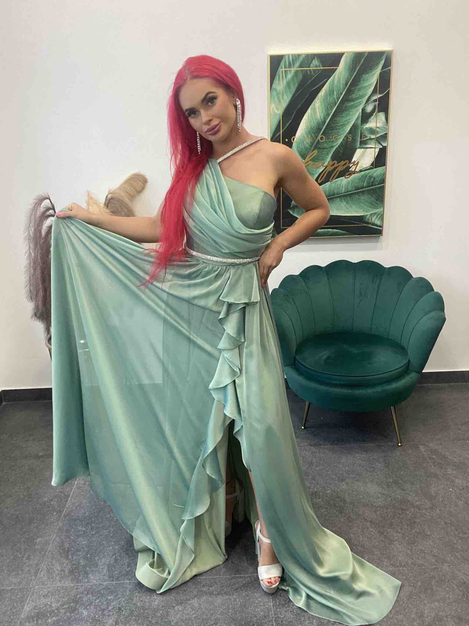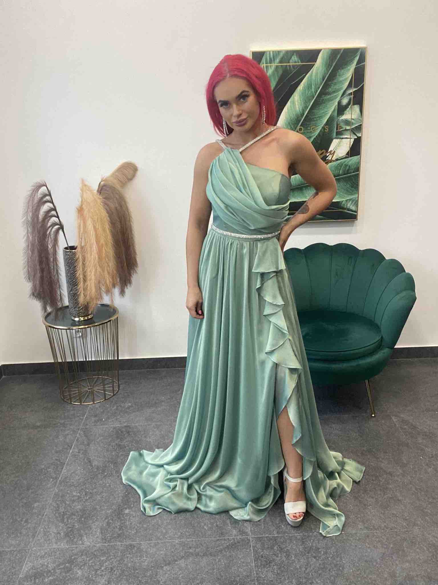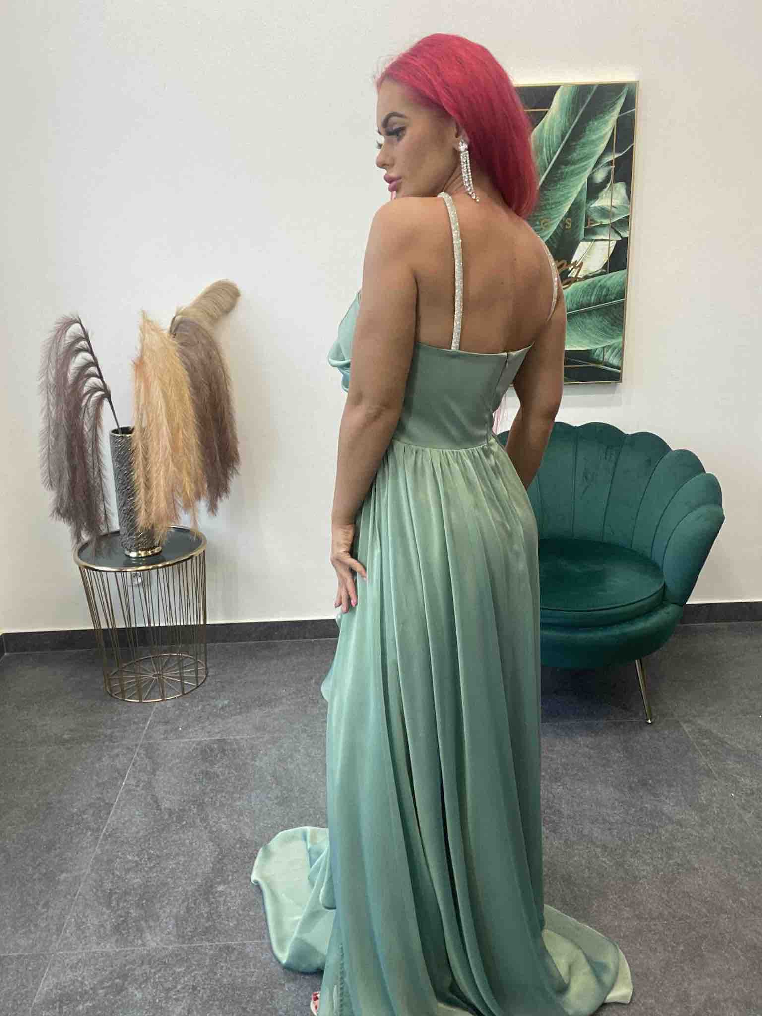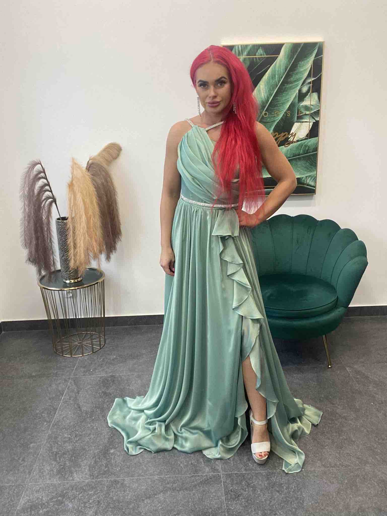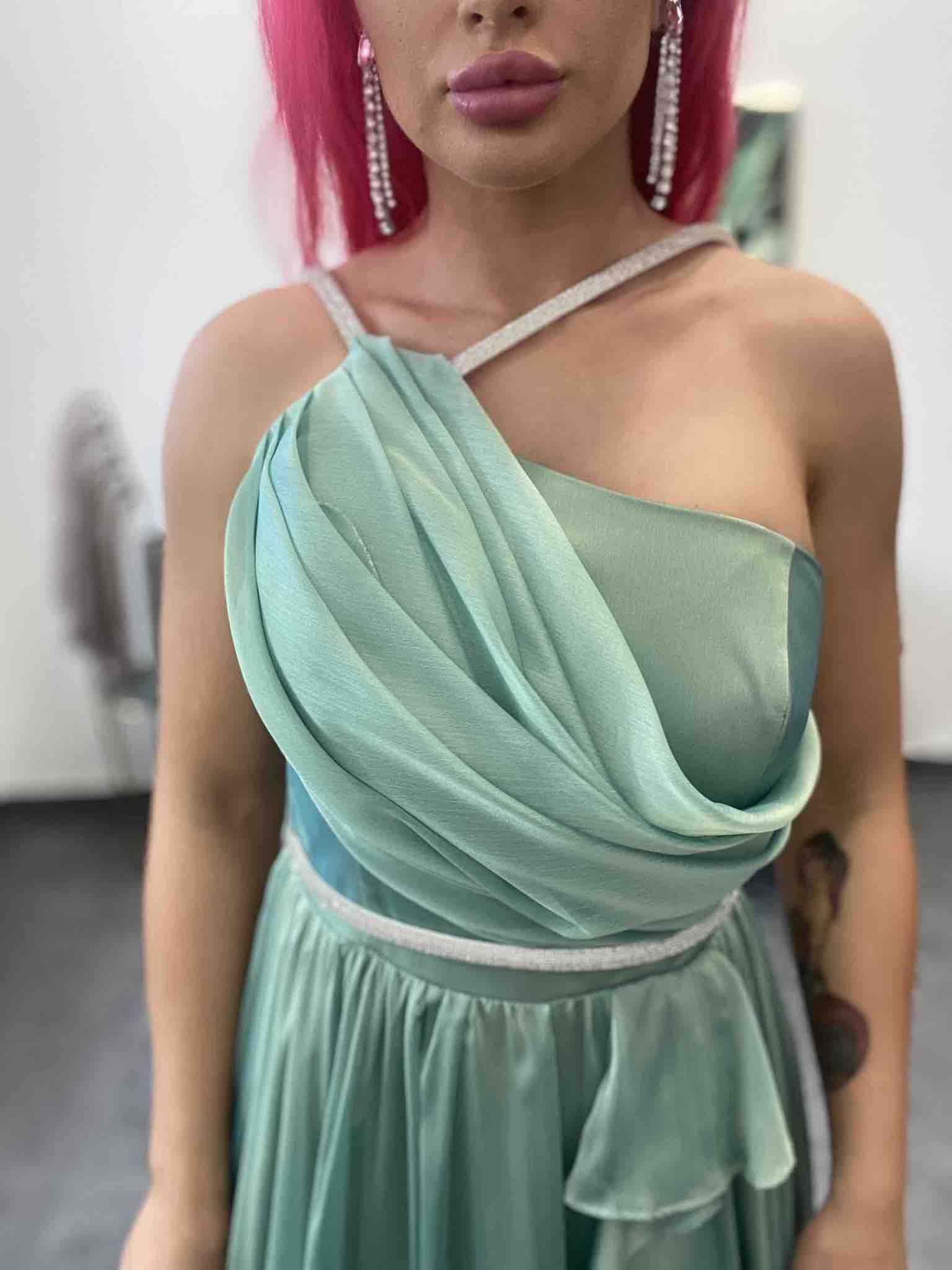 Dlhé turecké saténové šaty so strieborným ramienkom okolo krku – mentolové