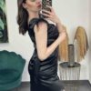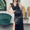 Elegantné dlhé šaty s ozdobnými pierkami na ramenách a rázporkom – čierne
